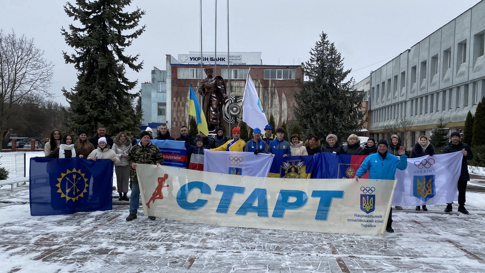 Вони зупинялись біля пам’ятників гетьману з розгорнутими Державним прапором України, прапорами Хмельницької області, міста Хмельницького, військового формування тероборони, НОК України та його відділення, покладали квіти і фотографувалися, привертаючи увагу містян до знакової події.